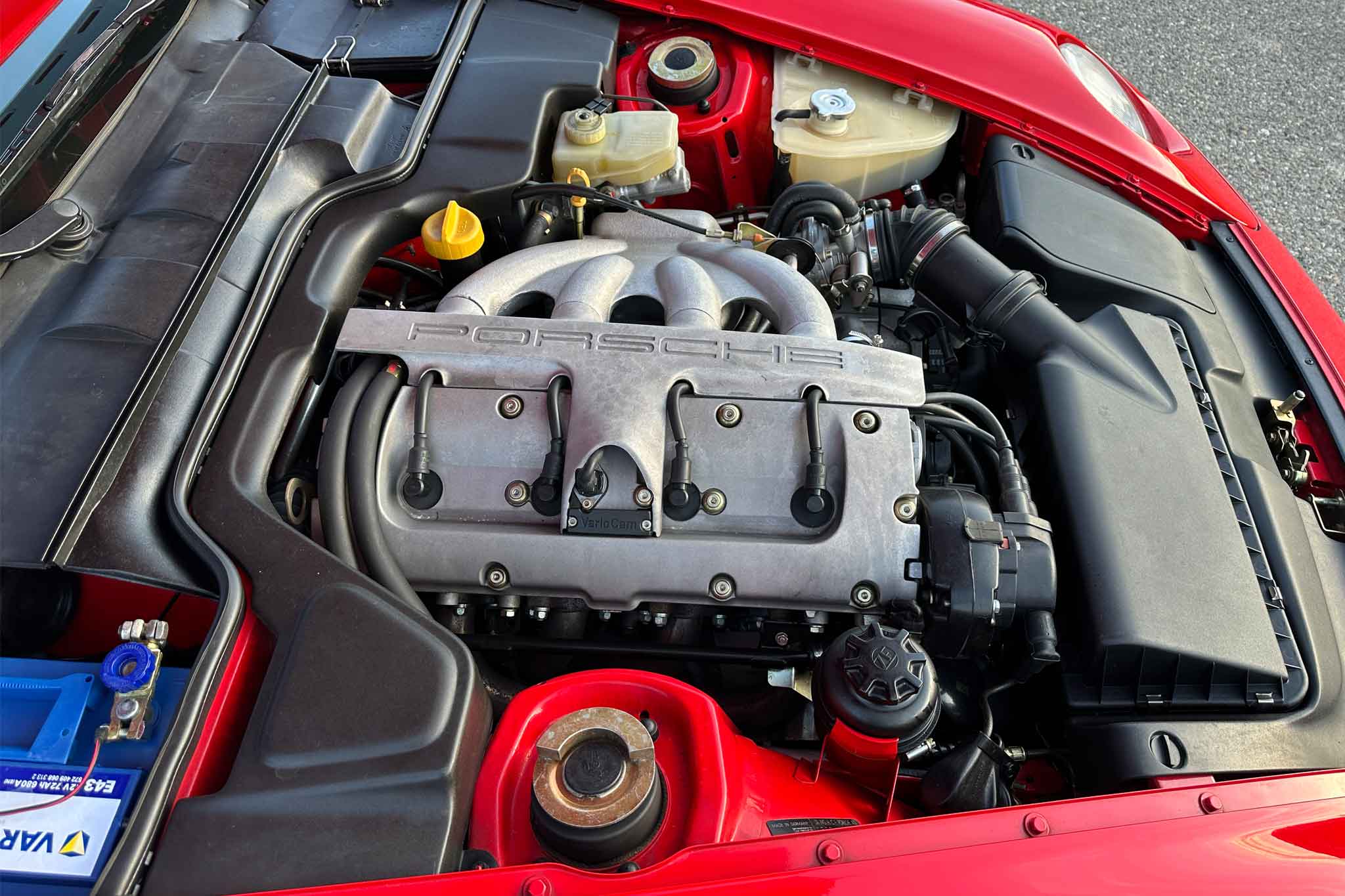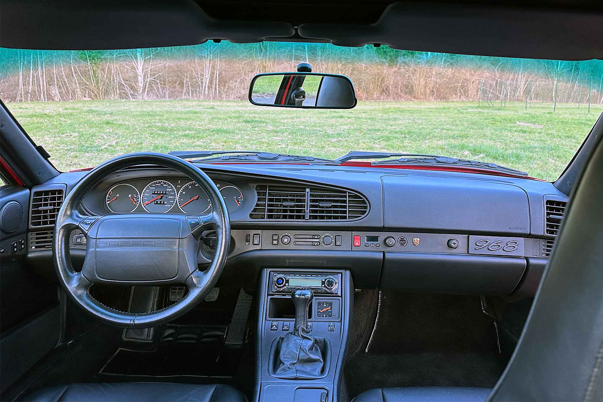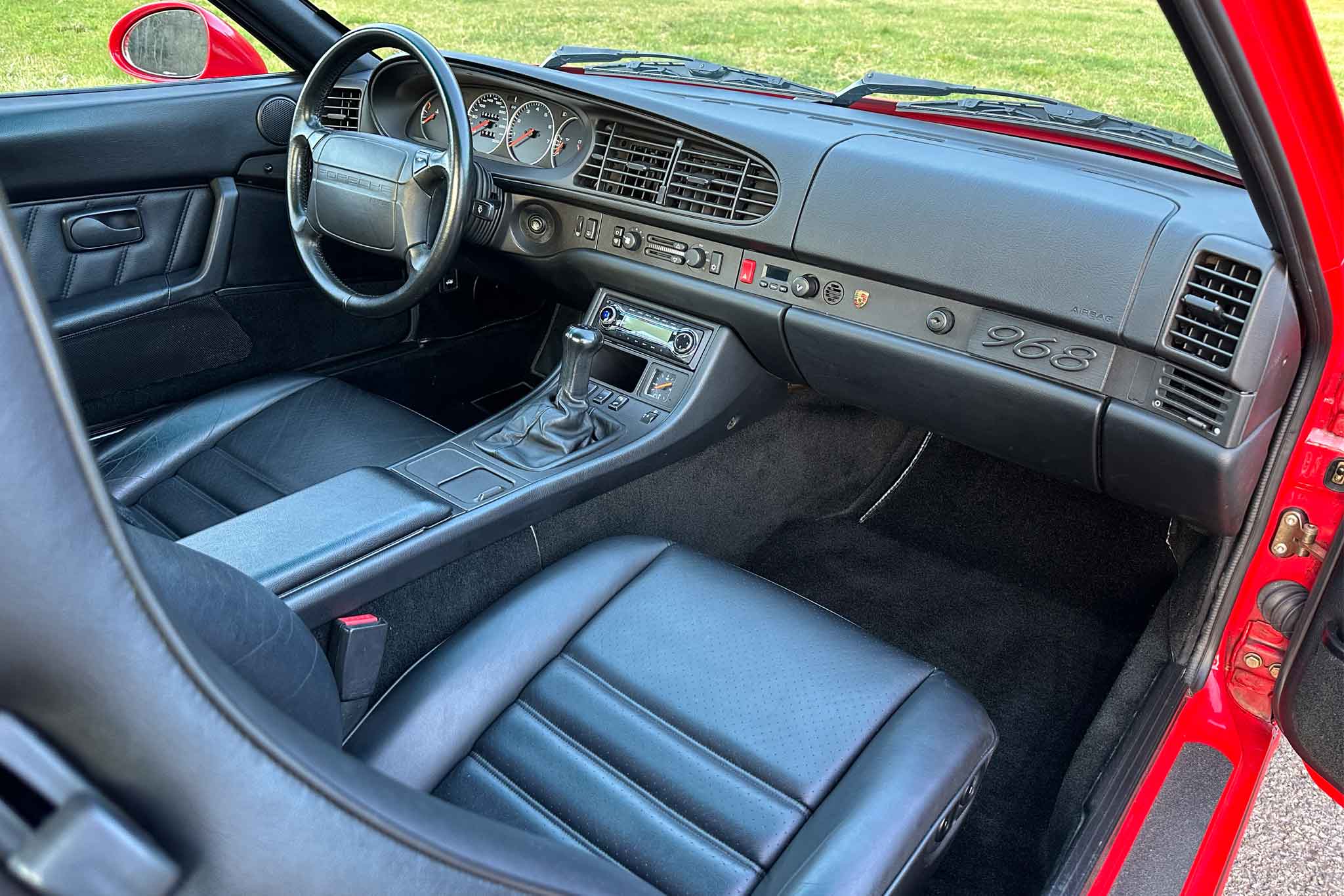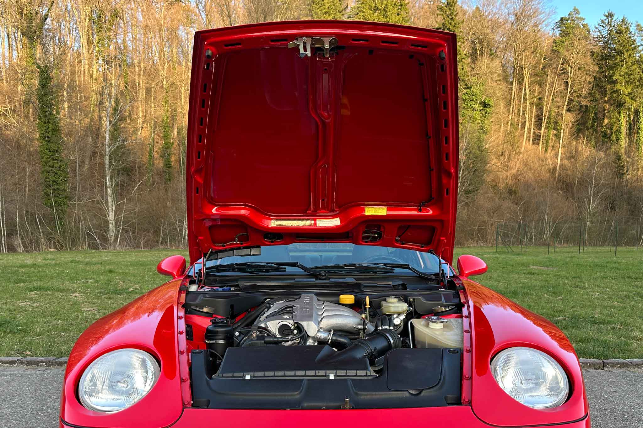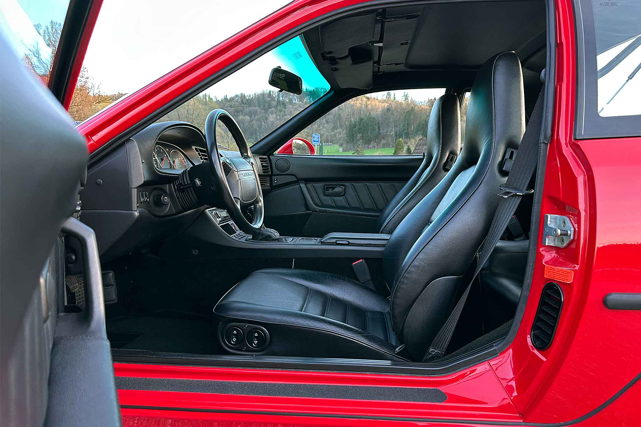 The Porsche 968 offered here was delivered new in March 1994 by AMAG Zurich in Indian Red with a black leather interior to the then 68-year-old first owner, who was fulfilling a lifelong dream. The car remained there for the next 21 years and was cherished and meticulously maintained before passing to its second owner in 2015. This beautiful Porsche 968, with only two previous owners, has just passed its MOT veteran inspection and is in incomparable collector’s condition—almost like new. The on-board folder containing all original documents, such as the owner’s and operator’s manuals, the neatly maintained warranty and service booklet, the emissions maintenance document, and various receipts, is included, as are all keys, the spare tire with compressor, and the on-board tool kit.