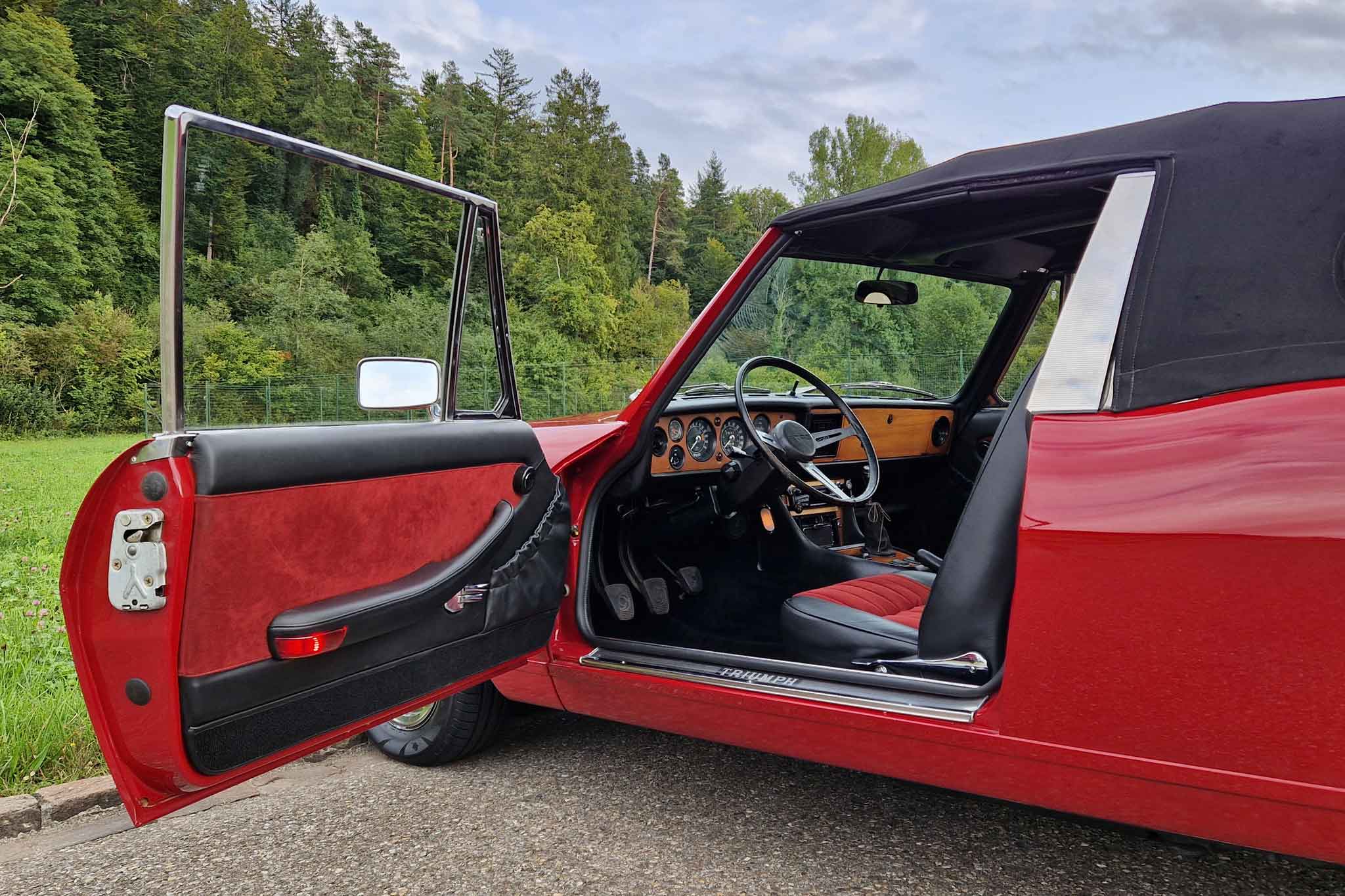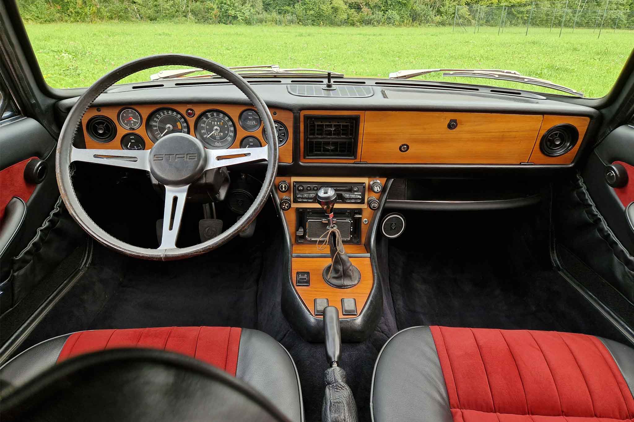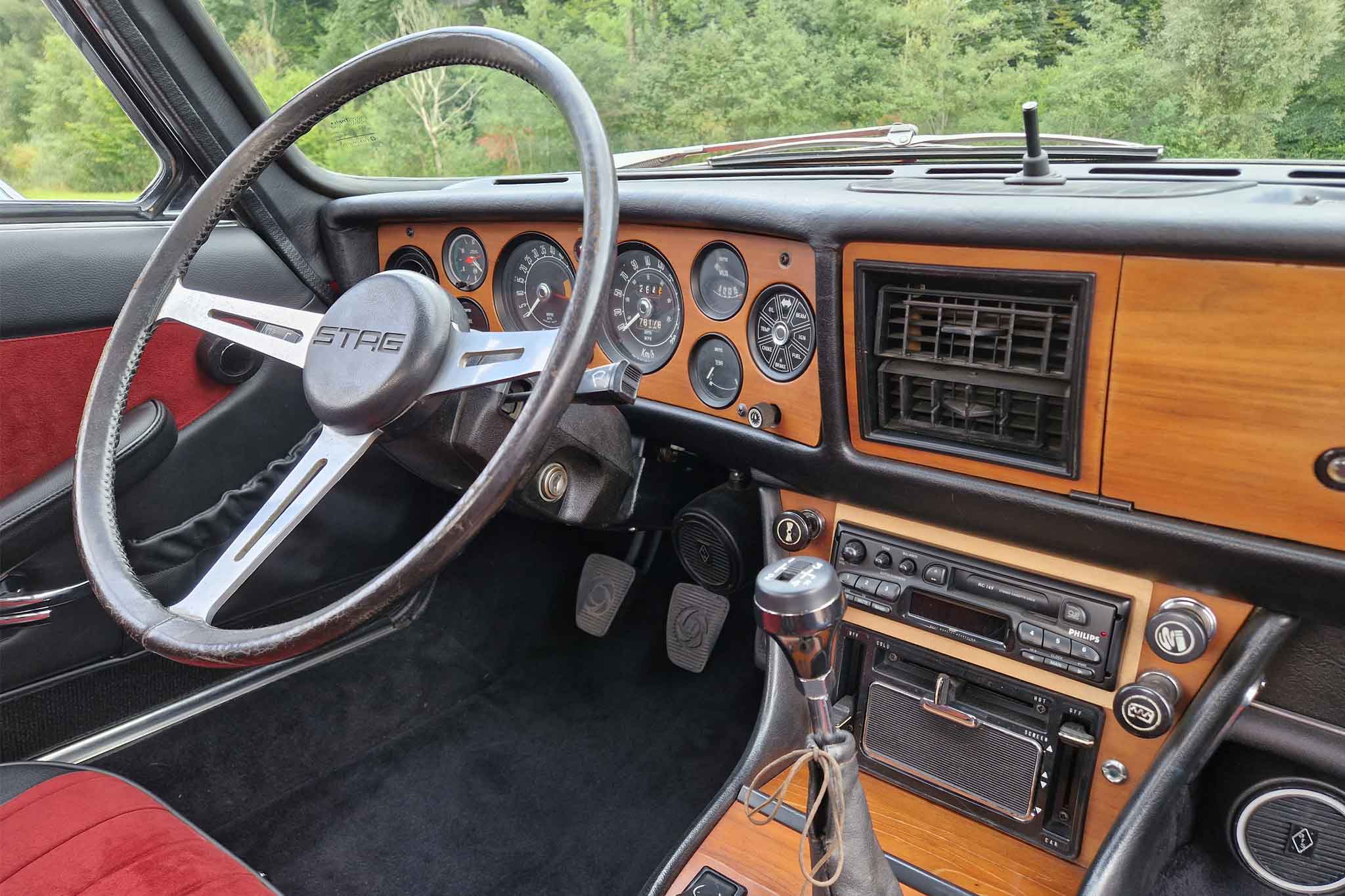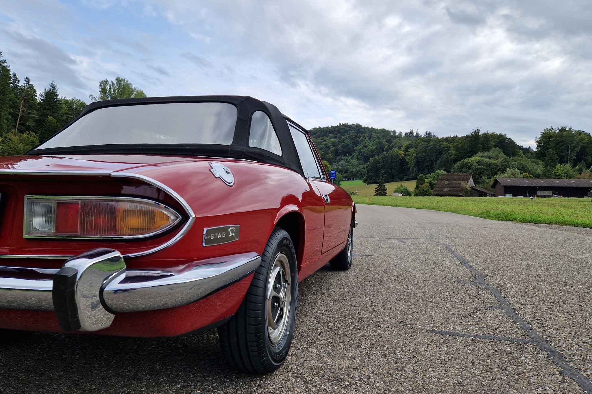 Der hier angebotene Triumph Stag wurde mit manuellem 4-Gang-Getriebe und dem optionalen Overdrive ausgeliefert und im August 1971 in der Schweiz das erste Mal zugelassen. Er war über 50 Jahre im zweiten und letzten Besitz und wurde dort über die Jahre Vollrestauriert. Das Auto befindet sich, neu bereift, in der Farbe Signal Red und Interieur Schwarz-Rot, in top gepflegtem Zustand. Über viele Belege und Rechnungen, zurück bis 1974, ist es sehr gut dokumentiert. Das originale Benutzerhandbuch mit Betriebsanleitungen, ein Teilekatalog und sogar originale Verkaufsprospekte sind vorhanden. Das ist die Gelegenheit, einen liebevoll restaurierten Stag zu einem schier unglaublichen Preis-Leistungs-Verhältnis zu erwerben.